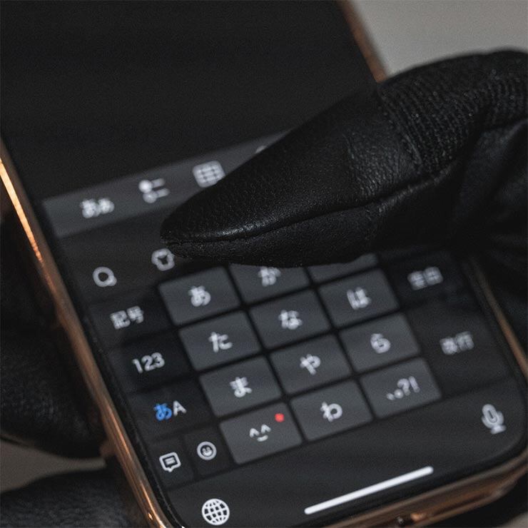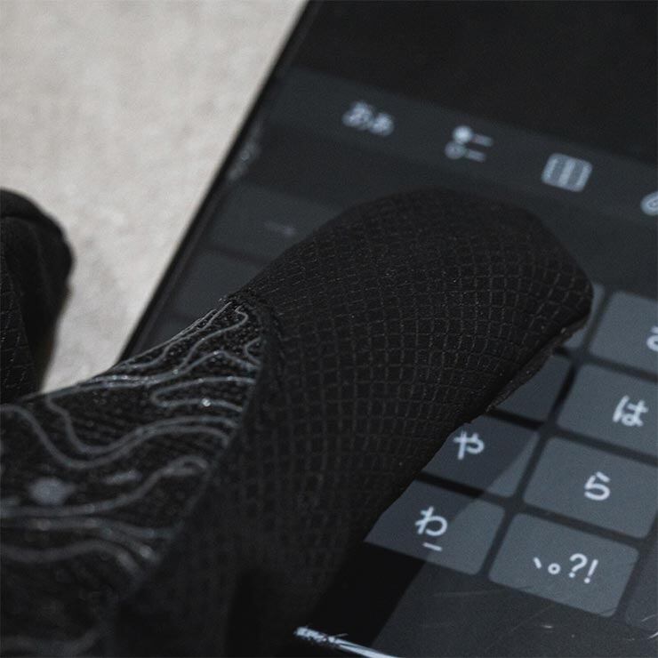 装着時もスマートフォンの操作ができるよう親指、人差し指には特殊素材を使用。