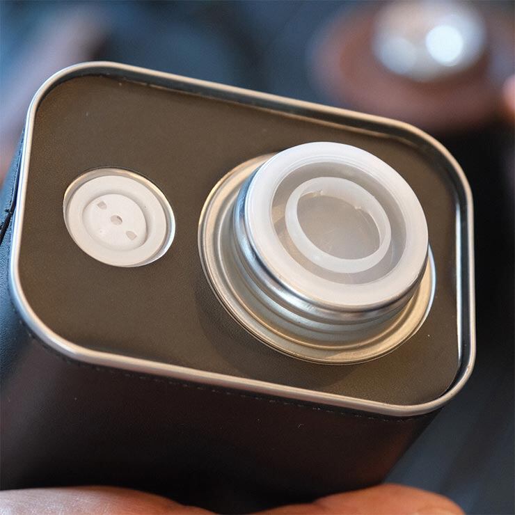ブリキ缶のキャニスター。空気弁が付いていて、豆から発生するガスを効率よく外へ排出、外部からの酸素の侵入を防ぎ鮮度を保ちます。