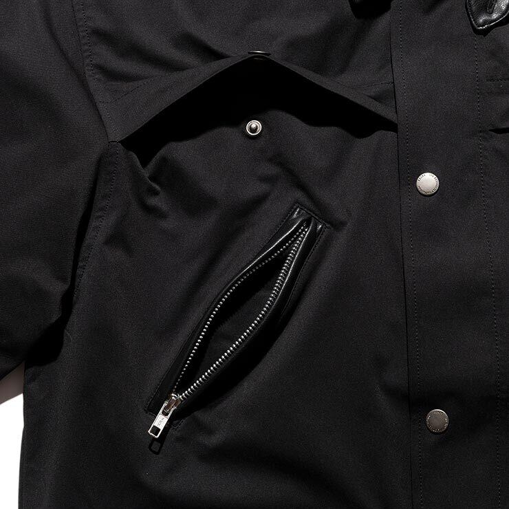 襟は合成レザーで切り替え、両肩と背中にはフラップ式の<br>