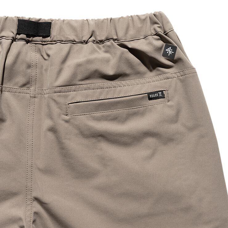 ウェービングベルトにはROARKのブランドアイコン、バックポケットにはブランドロゴがあしらわれています。<br>
