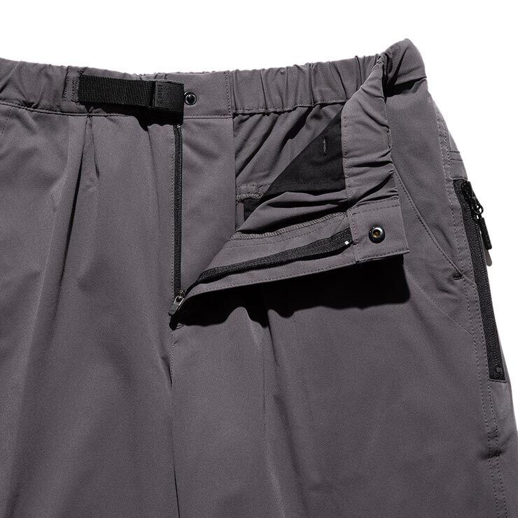 180度自然な開脚が可能なガゼットクロッチ、象徴的なバーティカルジップポケット、片手でも調整可能なベルトの仕様と高い機能性も併せ持つ。<br>