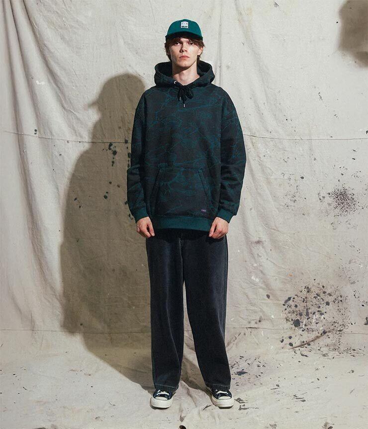 全体にグラフィックのヤードプリントを施し、フードにはフランチャイズロゴの同系色刺繍、<br>