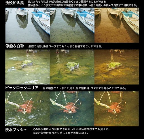 マリンスポーツでは水面のギラツキを軽減し、水中まで見えやすくなります。<br>