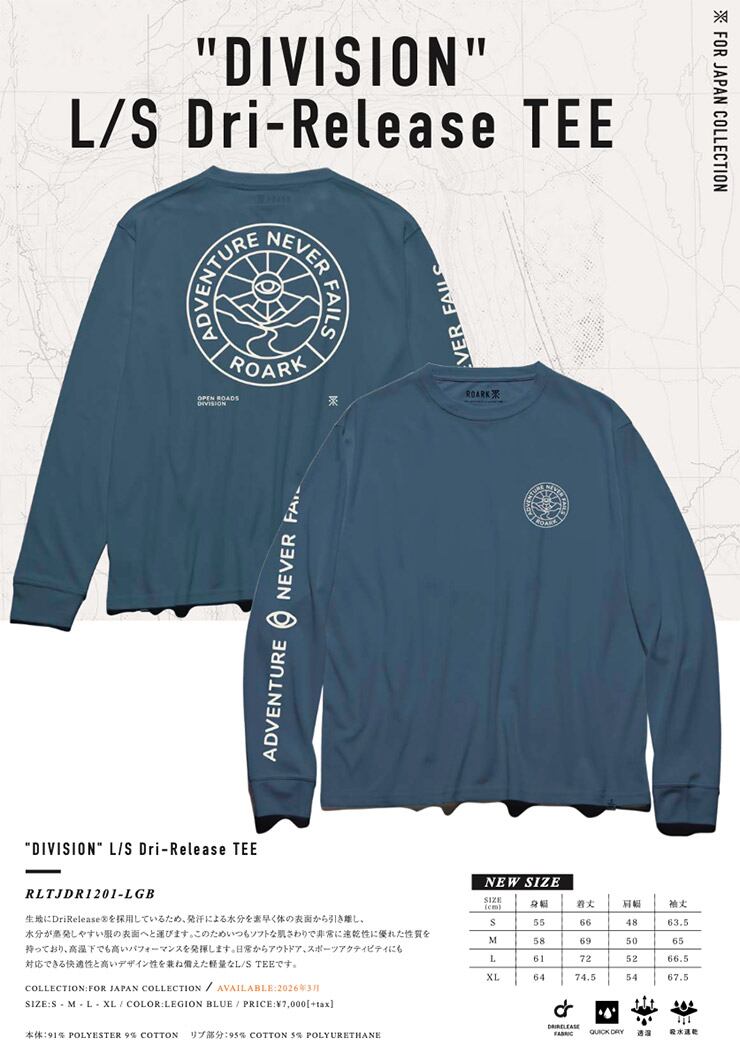 ROARK ロアーク DIVISION L/S Dri-Release TEE 長袖Tシャツ ロンT 吸汗速乾 メンズ レディース RLTJDR1201-LGB 26SP 日本代理店正規品