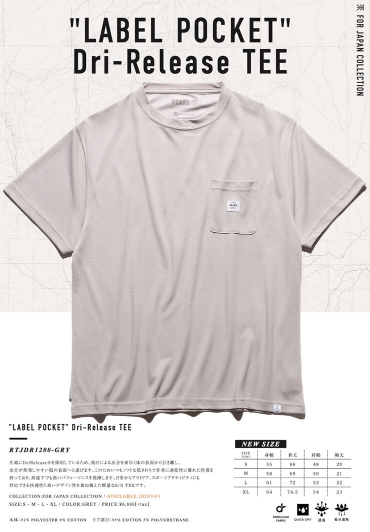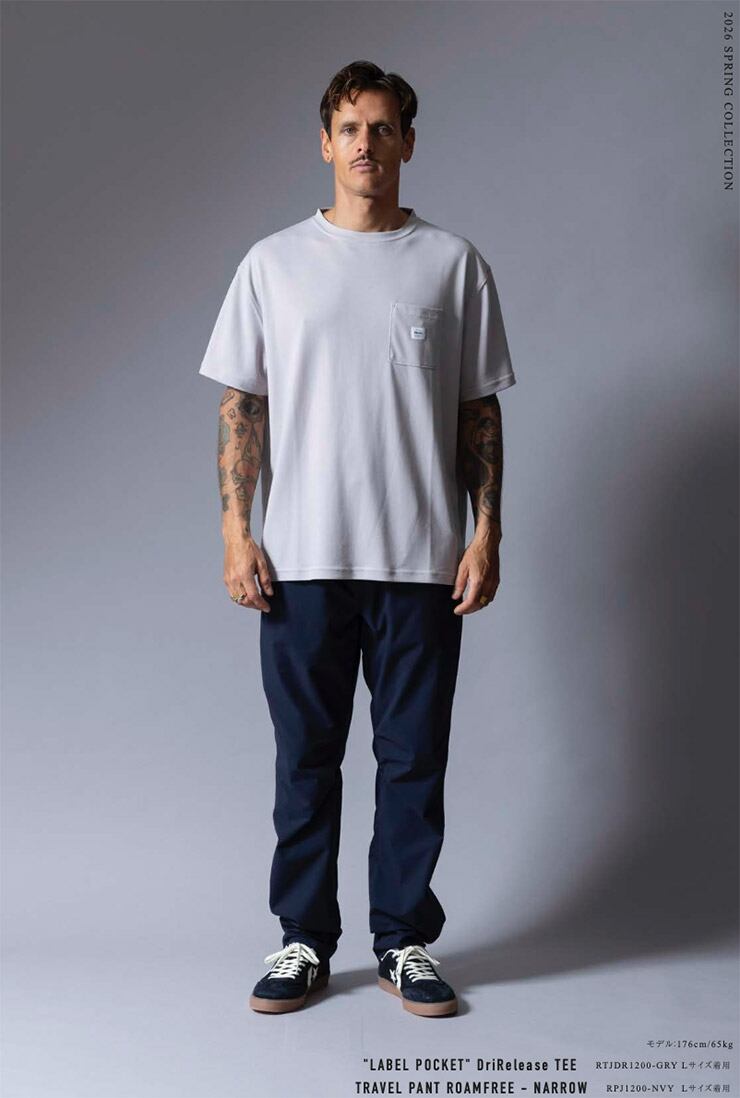 ROARK ロアーク Tシャツ メンズ 半袖Tシャツ ポケットTシャツ 速乾Tシャツ 吸水速乾 ドライTシャツ 軽量 LABEL POCKET DriRelease TEE RTJDR1200-GRY 26SP 日本代理店正規品