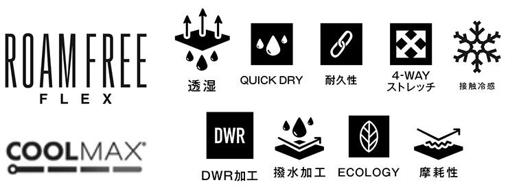 ・ストレッチ・撥水・耐久性の機能を併せ持つ、ROARK独自開発ファブリック<br>