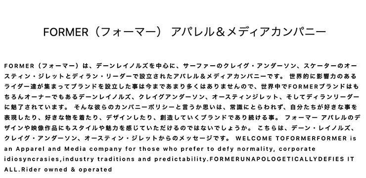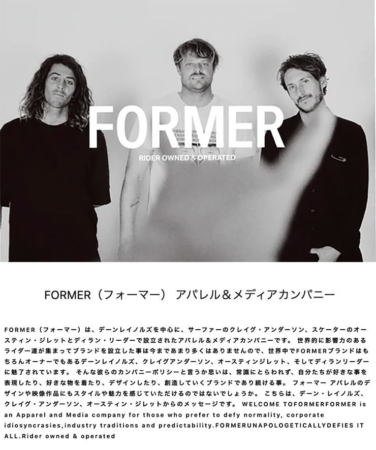 FORMER(フォーマー)は、デーンレイノルズを中心に、サーファーのクレイグ・アンダーソン、スケーターのオースティン・ジレットとディラン・リーダーで設立されたアパレル&メディアカンパニーです。